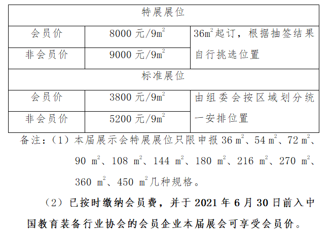 2.報名方式:原則上實行屬地化組團報名,即各企事業單位均在工商登記所在地報名。請各單位根據各自的生產銷售情況,依時申報展位,于2021年6月10日后登錄中國教育裝備行業協會管理系統(http://zh.m.zhihufw.com)填報展位及參會人員信息。展位9m2/個,特展展位4個起訂。企業申報展位并繳納展位費用,后組委會統一確定時間分配展位,展位一經安排,展位費用將不予退還。報名及繳費截止日期:2021年7月05日。